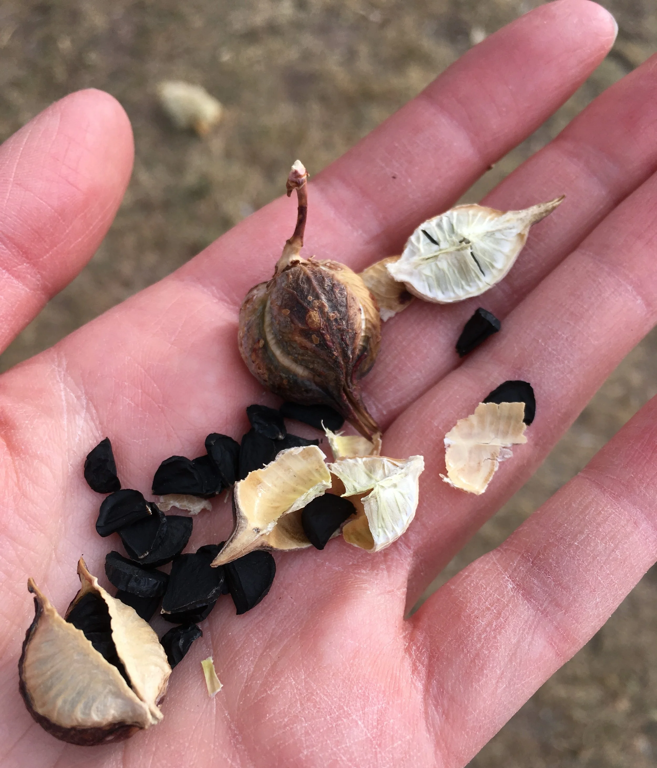Okay, I did it again: I’m a thief. This time I swiped some seed pods off a neighbor’s yucca. They were overhanging the sidewalk on the tips of the plant’s long stalks, and just about to burst and scatter their contents onto the concrete. So really I’ve rescued them, right? Instead of getting stepped on and swept off the curb, now they’re raked into the dirt along my yard’s southern fence, where—if my dog doesn’t dig them up, a very real possibility—I’m looking forward to yet another member in the growing community out there. Or, the community that’s growing out there. Take your pick.